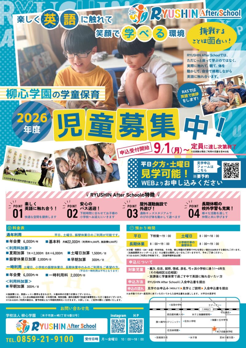 (TEL:0859-21-9100、E-mail :after-school@ryushin.ac.jp)